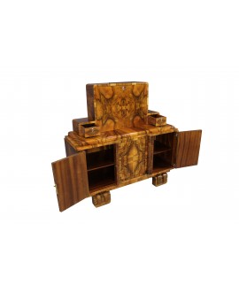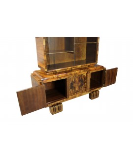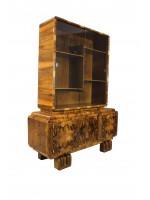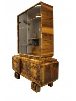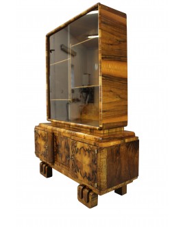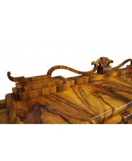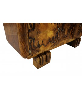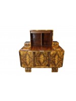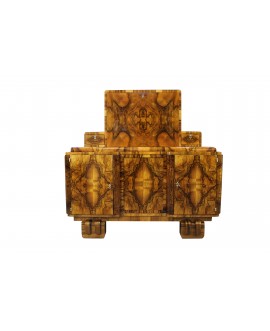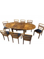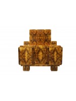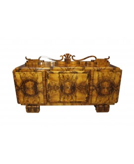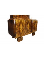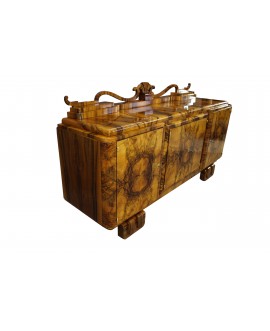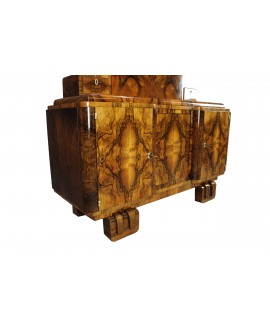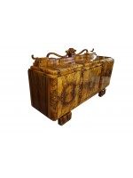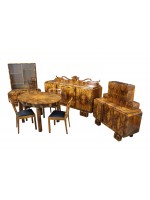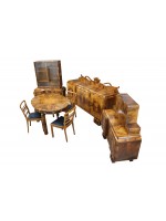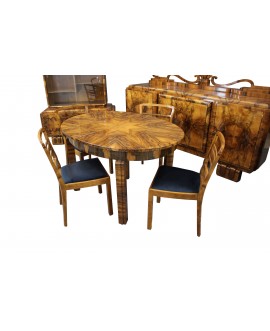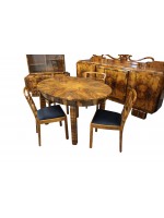 Nietuzinkowy komplet do salonu Art - Deco, w skład którego wchodzą: bufet, pomocnik, serwantka, rozkładany stół oraz osiem krzeseł.
