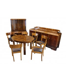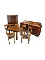 Komplet stołowy Art - Deco składający się z owalnego, rozkładanego stołu, czterech krzeseł oraz dwóch foteli senioralnych po gruntownej renowacji stolarsko - tapicerskiej.